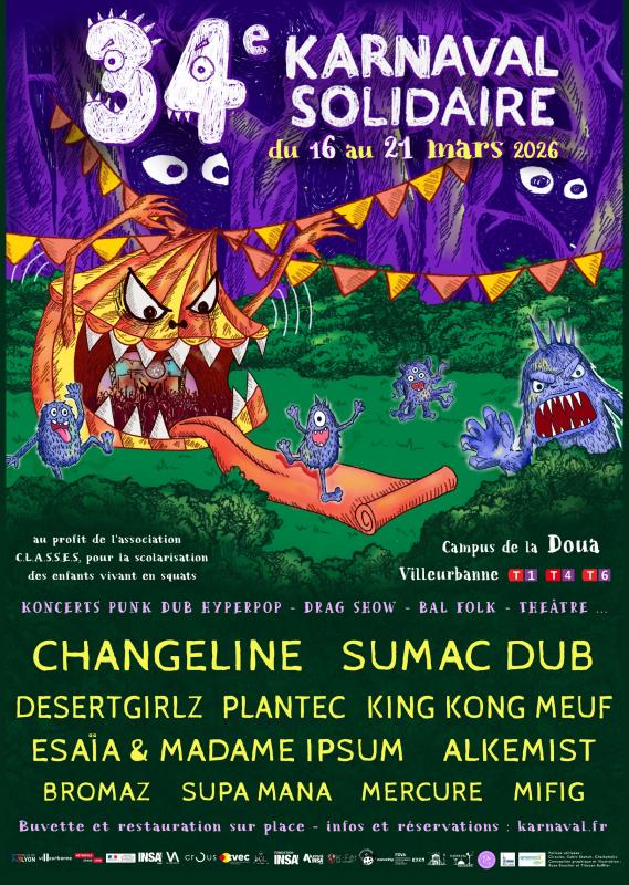 Comme tous les ans, le Karnaval Solidaire organise sa Semaine de la Solidarité sur le campus de la Doua, à Villeurbanne. Du 16 au 21 mars, venez assister à de supers concerts et spectacles sous un grand chapiteau ! Vous pourrez trouver sur site de la restauration locale et végétarienne et des boissons de brasseries locales. Les midi on y trouve des conférences d'actualité sur notamment le thème du festival cette année : La KarnaVallée des Monstres. Le jeudi après-midi c'est l'heure du défilé du Karnaval à travers Villeurbanne avec les enfants des écoles maternelles du quartier !
